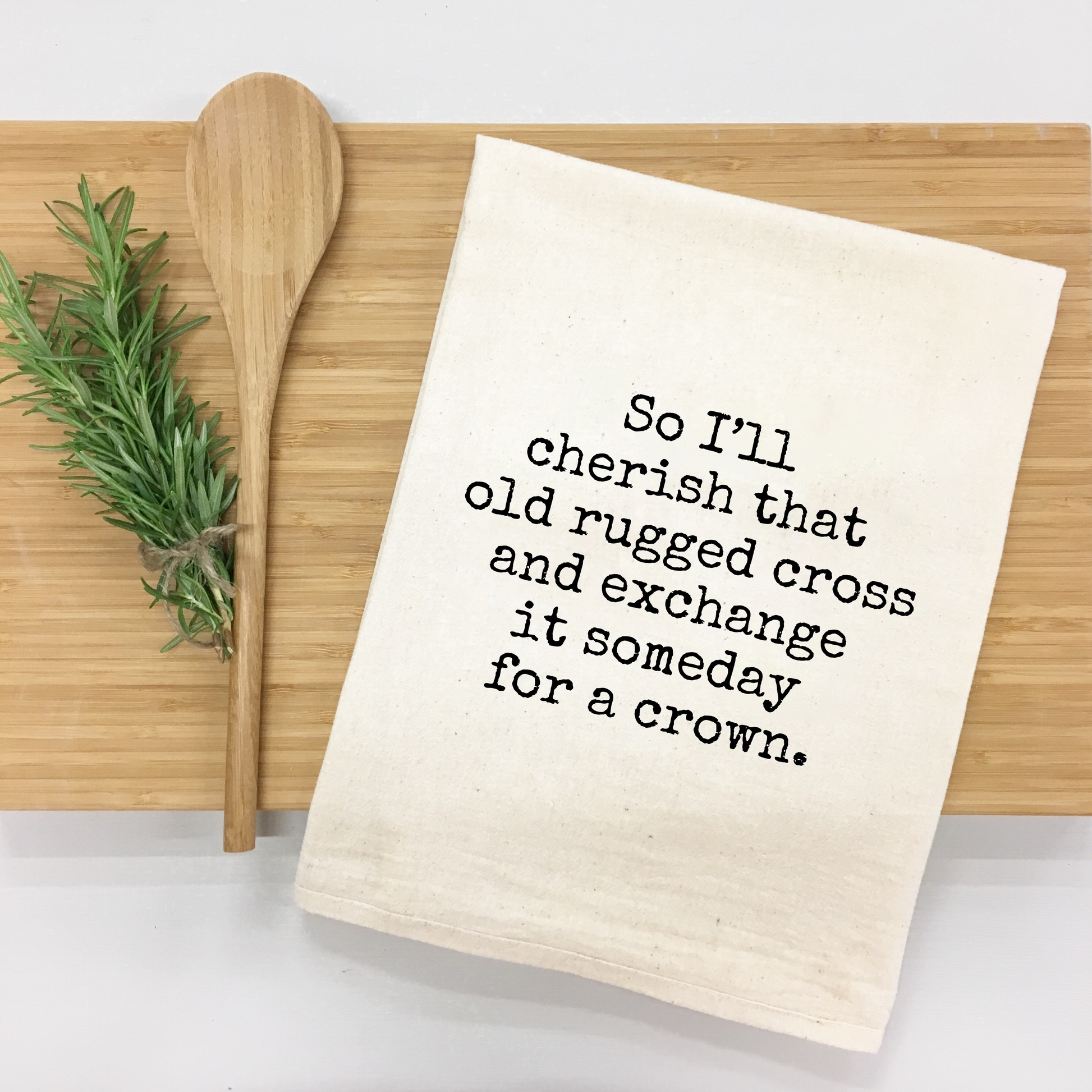 Celebrate your faith with our beautifully crafted kitchen towel featuring the cherished hymn lyrics, 'I will cherish that old rugged cross and exchange it someday for a crown.' This elegant towel adds a touch of spiritual inspiration to your kitchen decor, reminding you of the timeless promise and hope in every use.